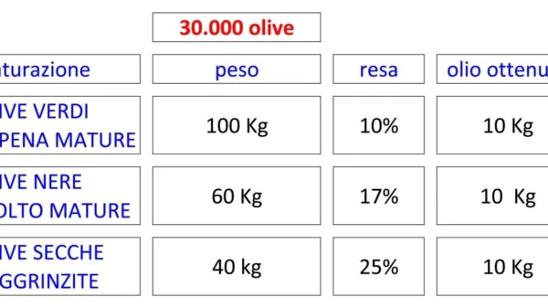 Si può ragionevolmente affermare che più l’oliva è scura e più l’oliva è matura e la raccolta dovrebbe avvenire nel momento in cui il prodotto contenuto nel frutto (nel nostro caso l’olio) raggiunge la massima quantità e un ottimo rapporto di sostanze fenoliche e di pigmenti.