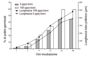 Questo dato evidenzia come anche piccoli miglioramenti nella funzionalità dei fiori e nella vitalità del polline possano tradursi in incrementi produttivi significativi. Studi agronomici hanno evidenziato che l’applicazione di acido borico (100 mg/L) durante la fioritura e nei 10–15 giorni successivi può incrementare l’impollinazione oltre il 20 – 25% (fig.2).