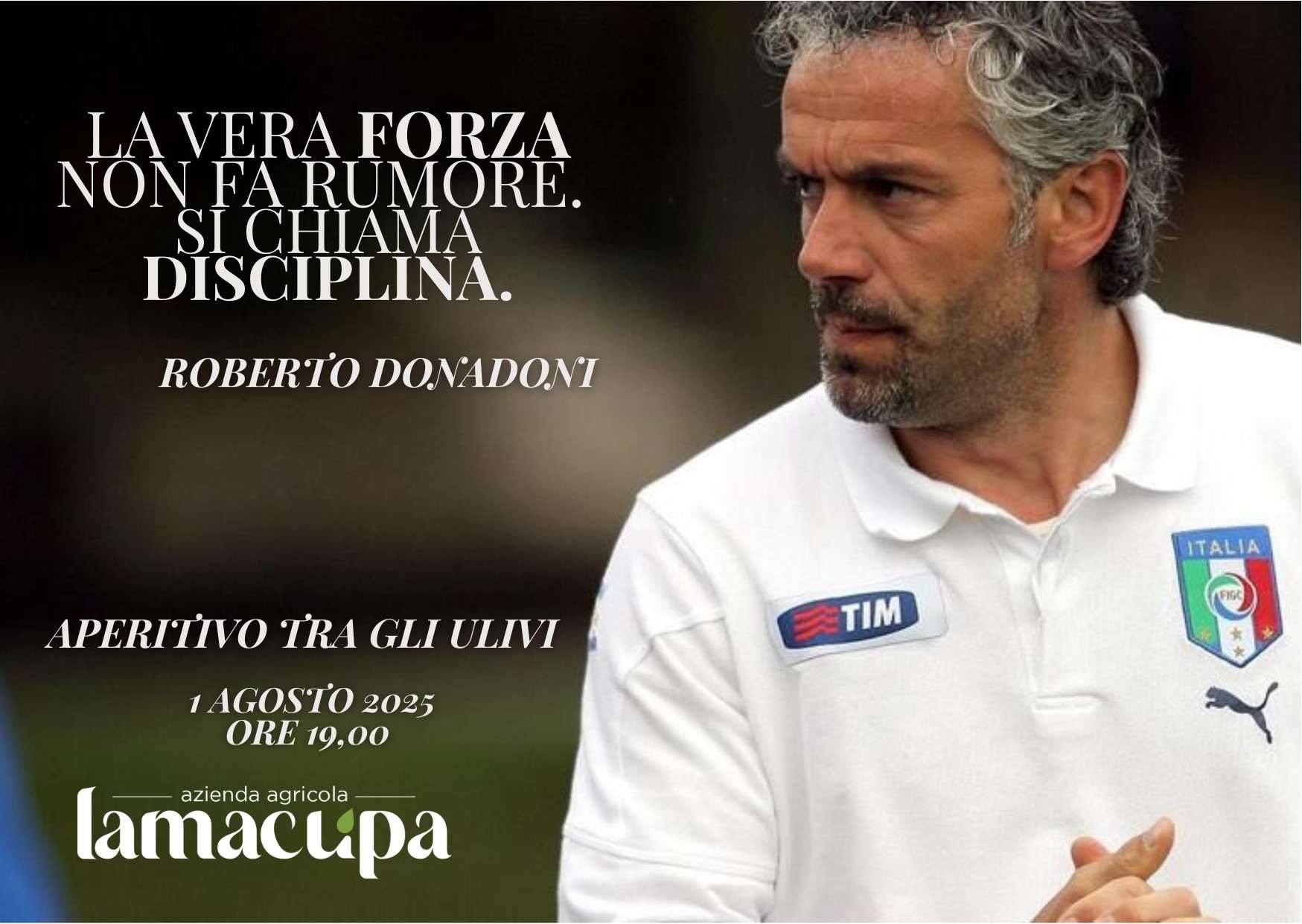Roberto Donadoni, stella della serie A e della Nazionale italiana, sarà il protagonista dell’evento che si terrà nell’uliveto dell’azienda Lamacupa a Corato. L’appuntamento è per venerdì prossimo, a partire dalle ore 19:00, nell’affascinante uliveto di famiglia, dove si fonderanno territorio, benessere, convivialità e memoria.
