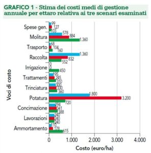 Il modello tradizionale (intorno alle 200 piante per ettaro), prevalente nelle aree collinari o storicamente vocate, la meccanizzazione della raccolta è limitata e il costo della manodopera incide fino al 60% della spesa annua. Il risultato è un’elevata vulnerabilità economica: bastano una o due annate sfavorevoli o cali produttivi anche moderati per compromettere il bilancio aziendale.