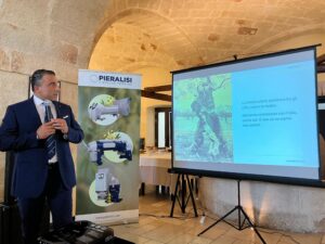 Da parte di Domenico Occhiogrosso e Stefano Ponzetti, poi l’illustrazione sia del potenziamento del service Pieralisi in Italia, ed in Puglia in particolare, sia dell’evoluzione del concetto di manutenzione, che da preventiva diventa predittiva, capace cioè, con sensoristica adeguata a distanza, di prevedere anzitempo eventuali necessità di interventi, così da scongiurare pericolosi fermi macchina in piena campagna.