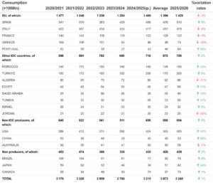 il consumo globale potrebbe raggiungere le 3.248.000 tonnellate nella stagione 2025/26, il che rappresenterebbe un aumento dell’1,0% rispetto alla stagione precedente.