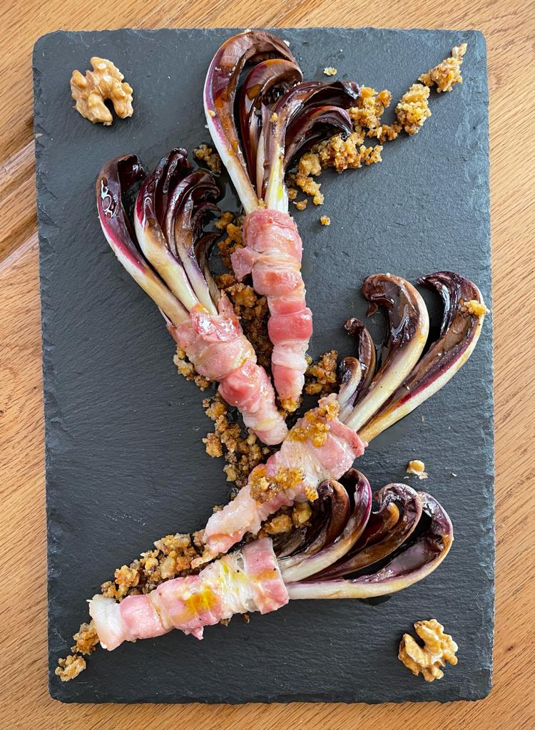 • Disporre gli spicchi di radicchio arrotolati nella pancetta e cosparsi di crumble su una teglia da forno, salare, pepare
