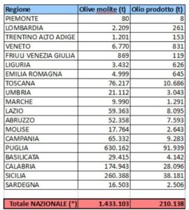 Ecco nel dettaglio, regione per regione, le olive molite e l’olio prodotto in tonnellate sulla base dei dati Sian aggiornati al 15 dicembre.