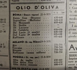 Se volgiamo lo sguardo indietro, un documento del 1936 ci restituisce un’immagine sorprendente: quanto valeva davvero l’olio d’oliva quasi novant’anni fa? Le date riportate nel listino, come “22-8-XIV” e “24-8-XIV”, corrispondono al calendario fascista, quindi al 22 e 24 agosto 1936, confermando la collocazione storica del documento.