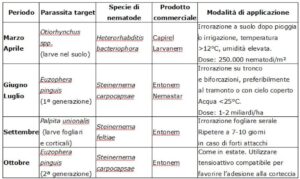 Si riporta un esempio pratico di una possibile strategia stagionale con nematodi entomopatogeni per l’olivo peri il controllo biologico