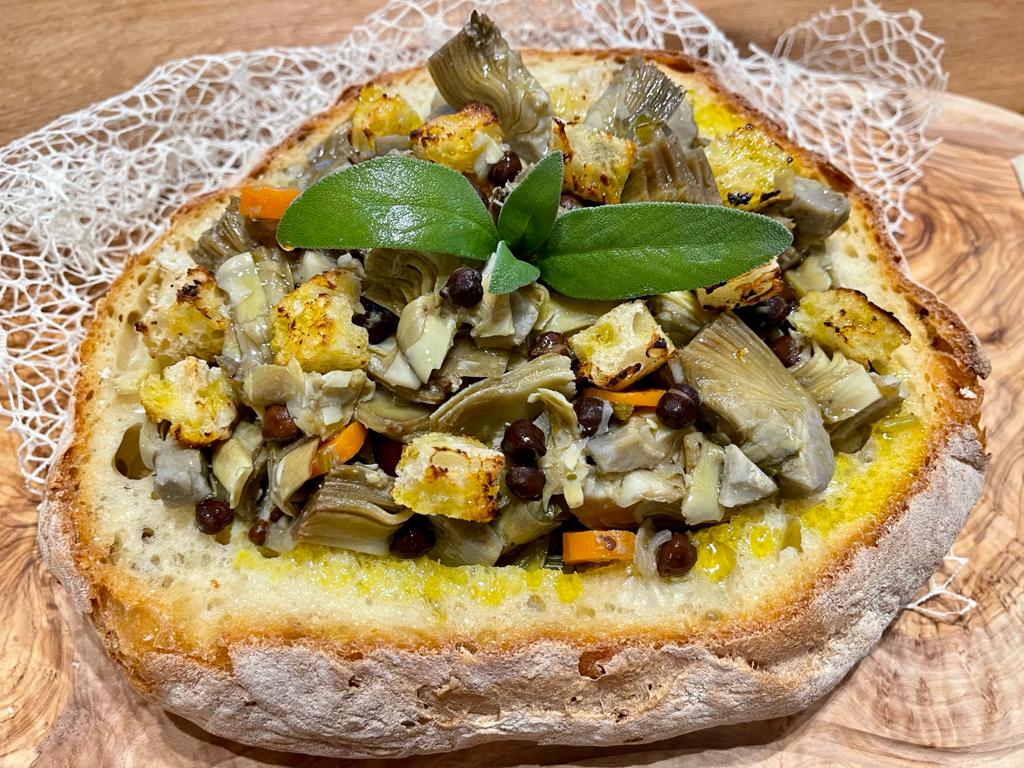 Svuotare la mollica della metà inferiore di una pagnotta conservando un bordo di c.ca 2-3 cm (l’altra metà va tagliata a pezzetti e abbrustoliti). Pulire i carciofi eliminando le foglie esterne più dure e coriacee, tagliare a spicchi e immergerli in una soluzione di acqua acidulata con il succo di limone per non farli annerire.